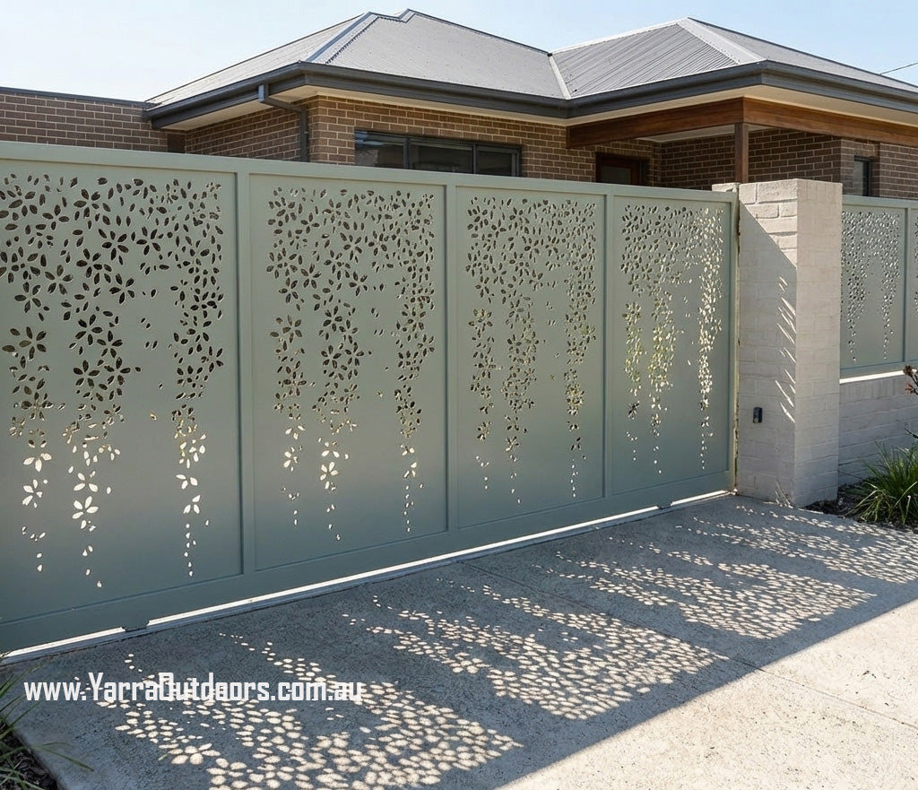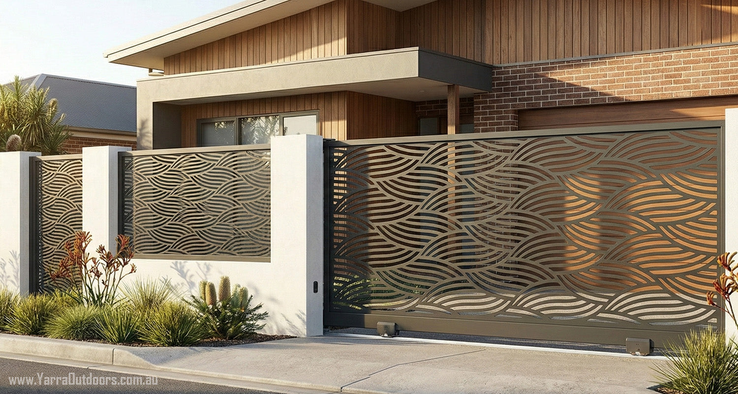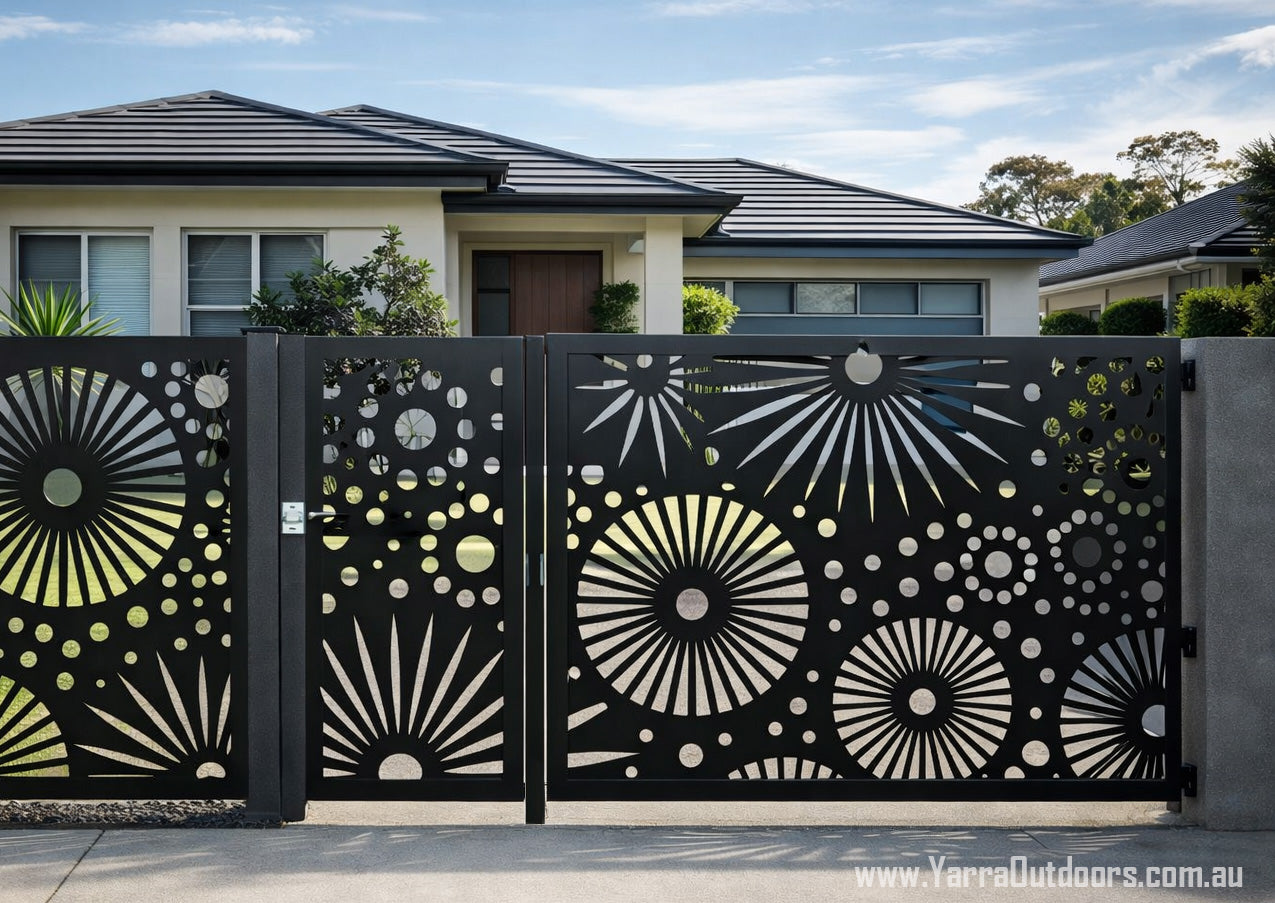 Enhance your home’s street appeal with custom laser-cut gate panels from Yarra Outdoors. Designed and manufactured in Australia, our gates combine modern architectural design with durability, privacy, and security — perfectly tailored to your space.
