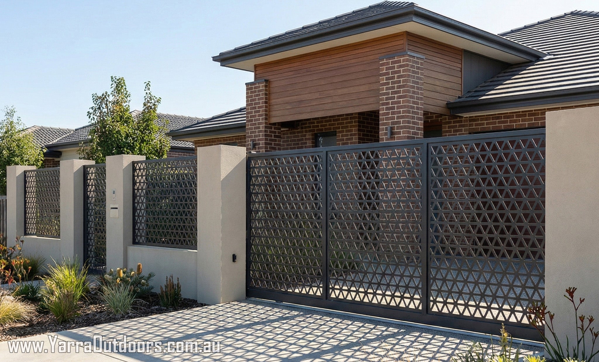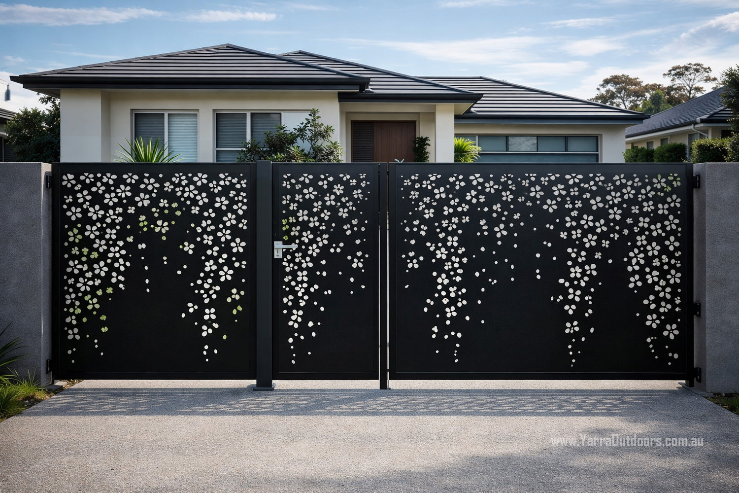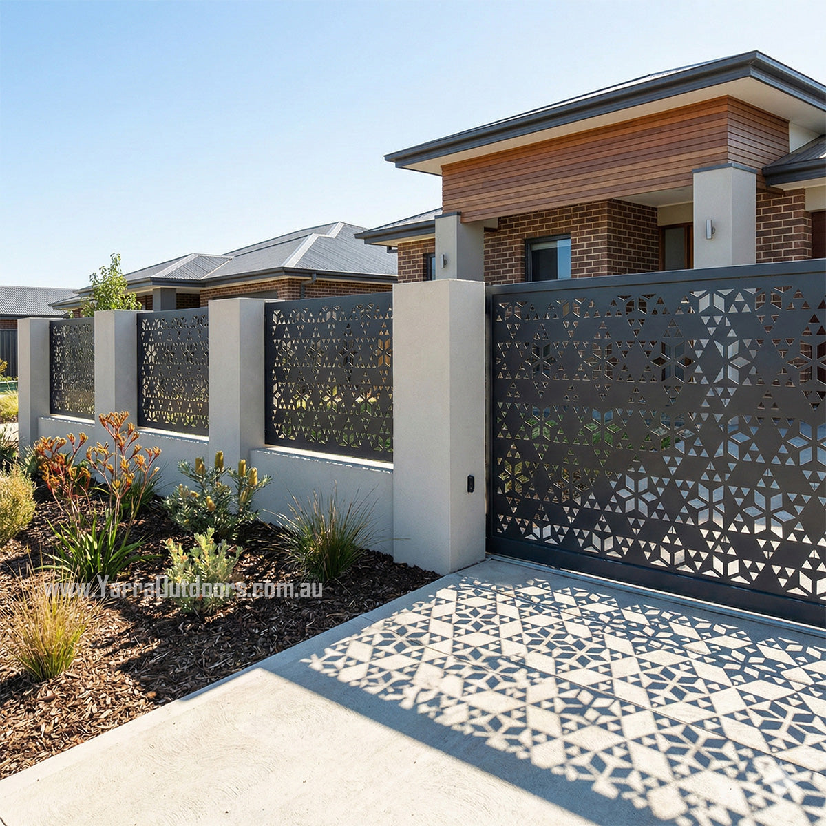 Enhance your home’s street appeal with custom laser-cut gate panels from Yarra Outdoors. Designed and manufactured in Australia, our gates combine modern architectural design with durability, privacy, and security — perfectly tailored to your space.